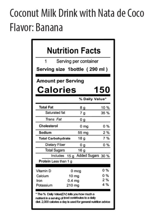 Ingredients: Water, Coconut Milk, Sugar, Nata de Coco, Sodium Caseinate (a milk derivative).