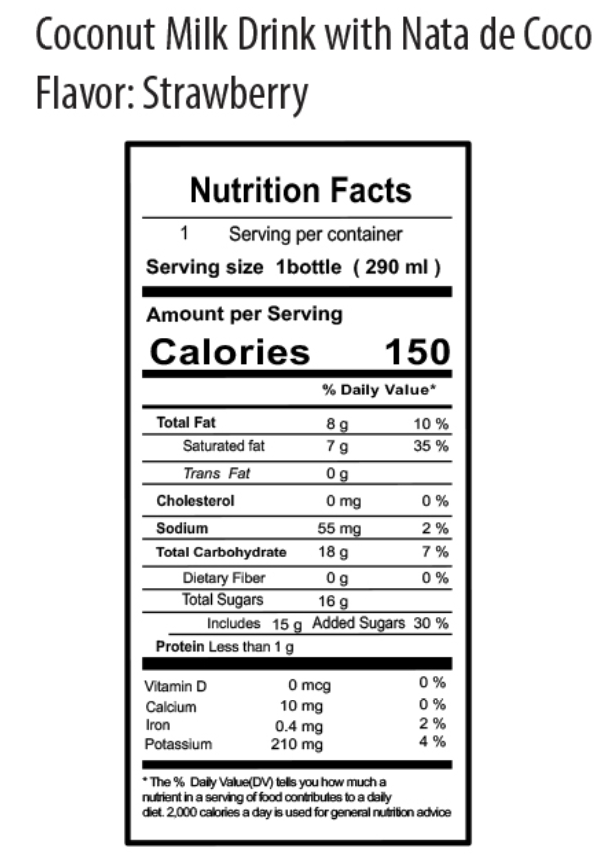 Ingredients: Water, Coconut Milk, Sugar, Nata de Coco, Sodium Caseinate (a milk derivative), Artificial Strawberry Flavor, FD&C Red No.40.